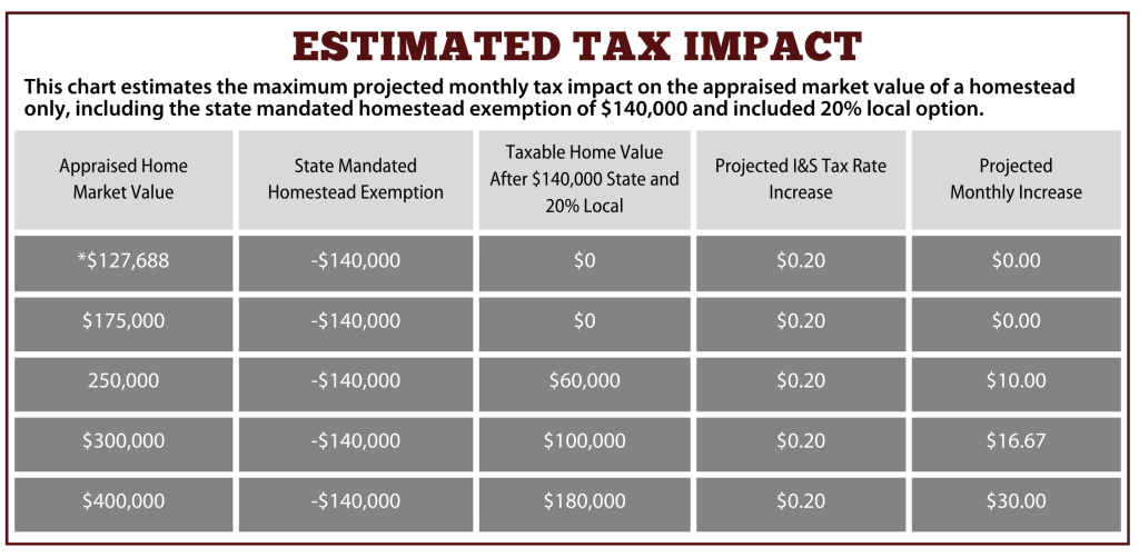 If voters approve the bond, the District’s Interest & Sinking (I&S) Tax Rate would increase 20 cents, resulting in an estimated cost of $10 per month for the owner of a $250,000 homestead. With the mandated homestead exemption of $140,000 and additional 20% local exemption, the average Waskom ISD home value of $127,688 would have a zero-tax rate increase.